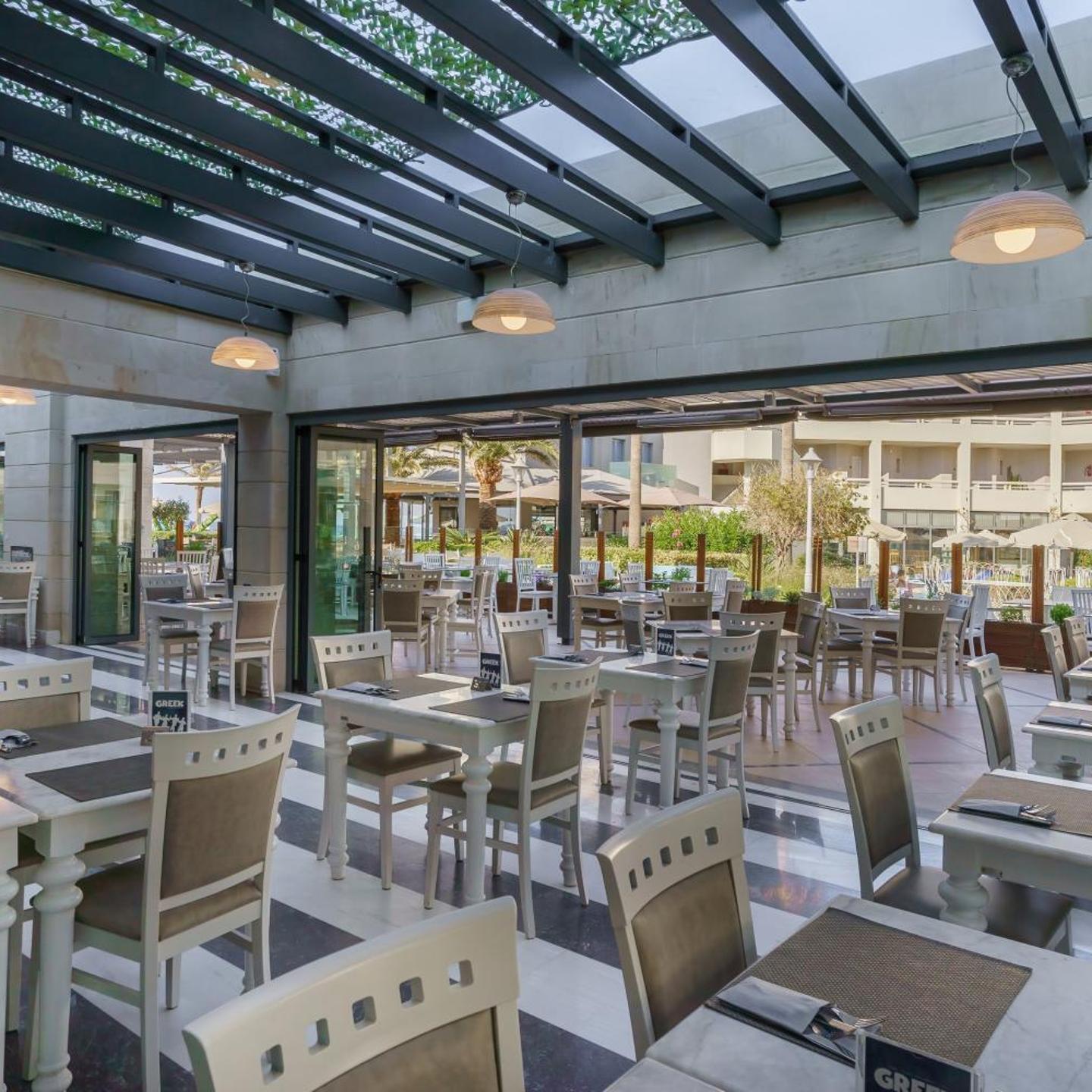Ariadne Restaurant serves a rich dinner buffet at its terrace. Brasserie Panorama serves snacks and lunch with views of the sea and the pool.