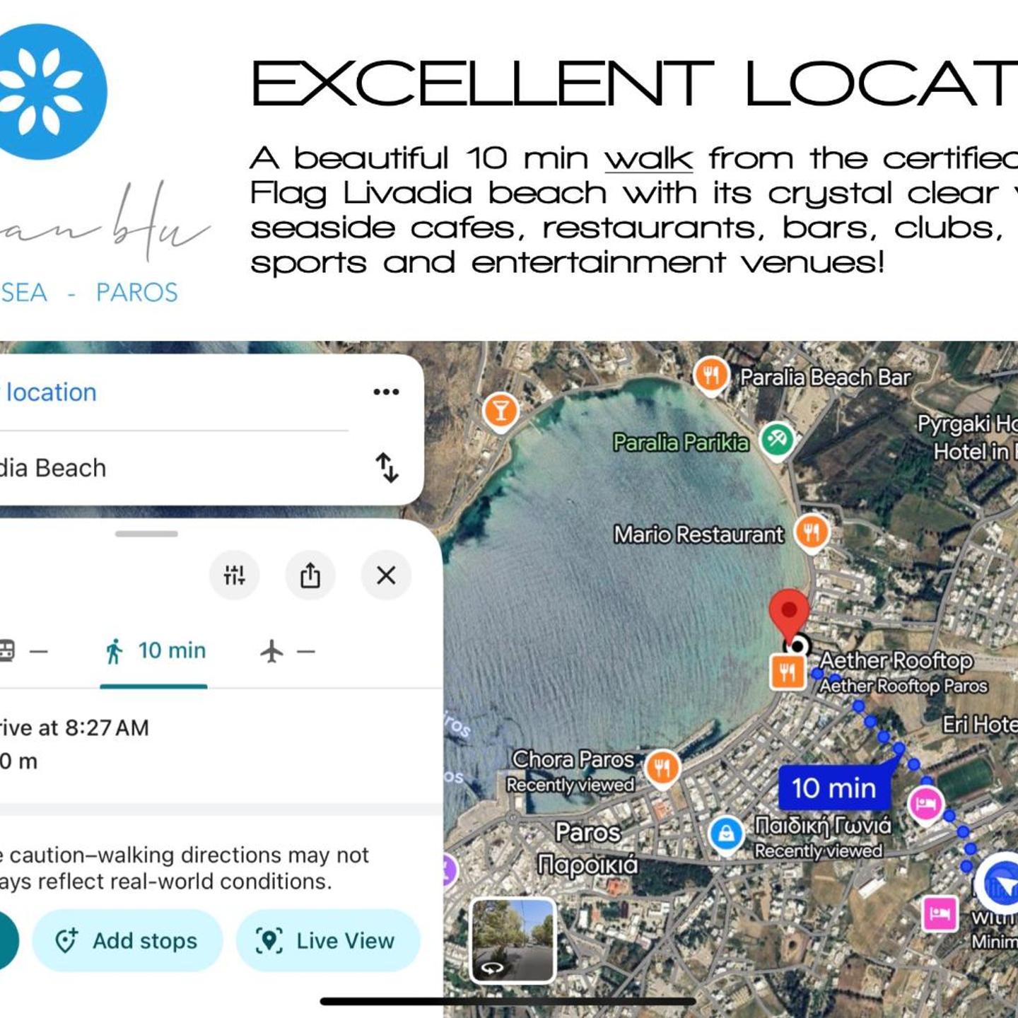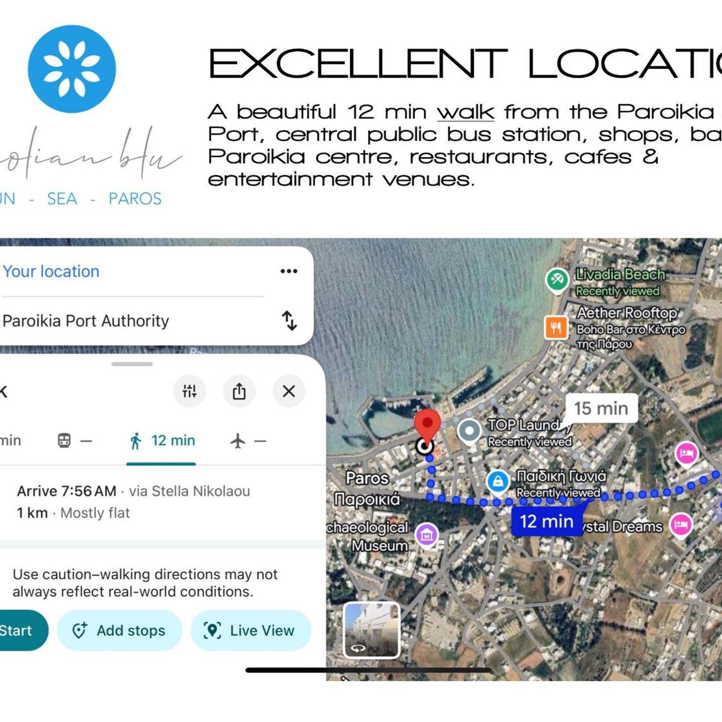 Our location is excellent,we are a beautiful 12min walk from the Paroikia main port,a 10min walk to the famous Blue Flag Livadia Beach,a 10min walk to seaside cafes, restaurants, shops, pharmacies, banks & entertainment venues & a 12min walk to the central public transport bus station which allows you to see all of Paros.