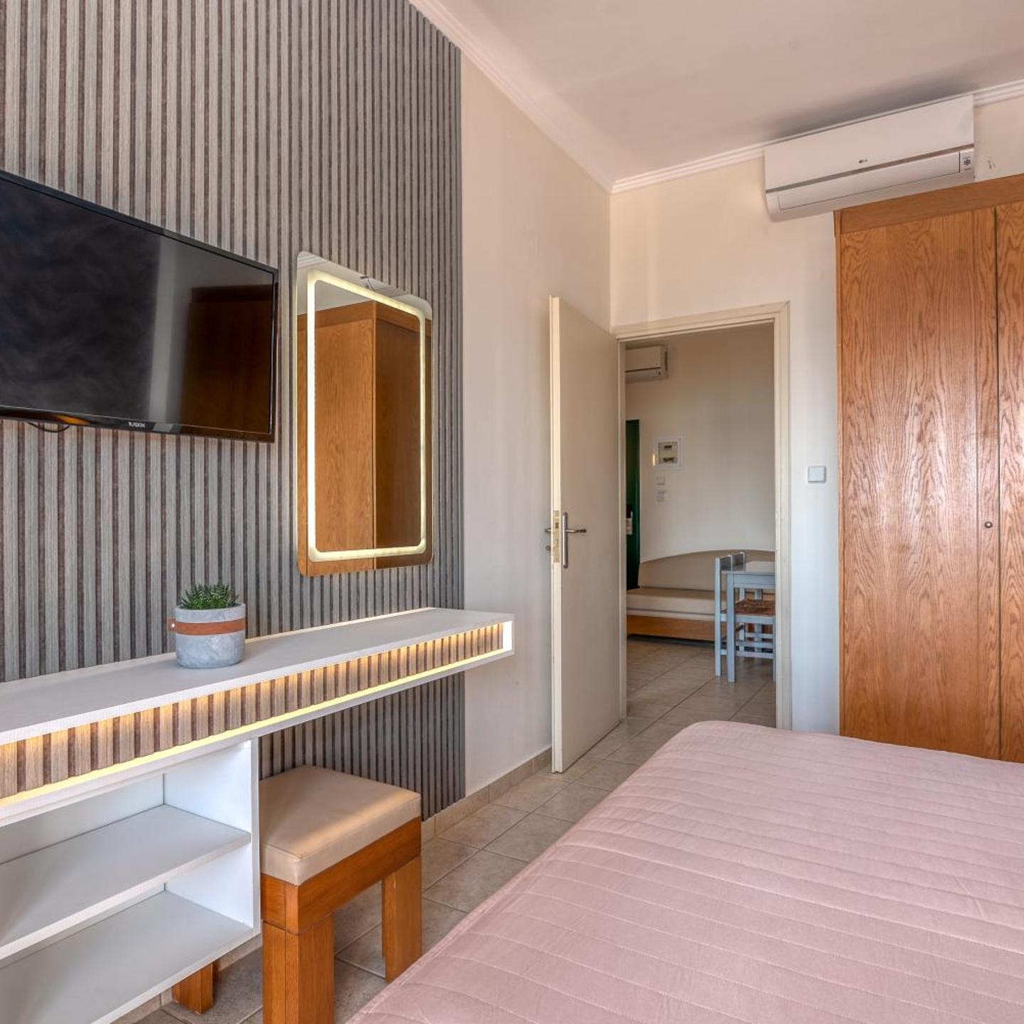 Modernly decorated, the air-conditioned units come with a flat-screen TV and a safety deposit box. Each includes a kitchenette with fridge and kitchenware, and a furnished balcony with views of the sea or the pool.