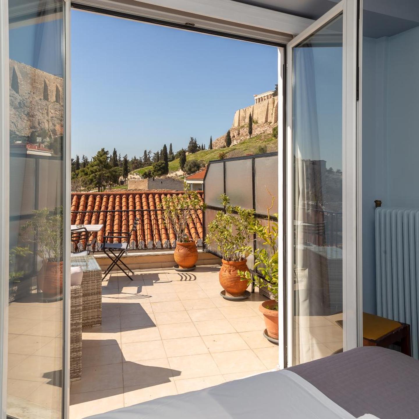 ארוחת הבוקר מוגשת בגינת הגג, שמציעה נופים נעדרי הפרעה של האקרופוליס.