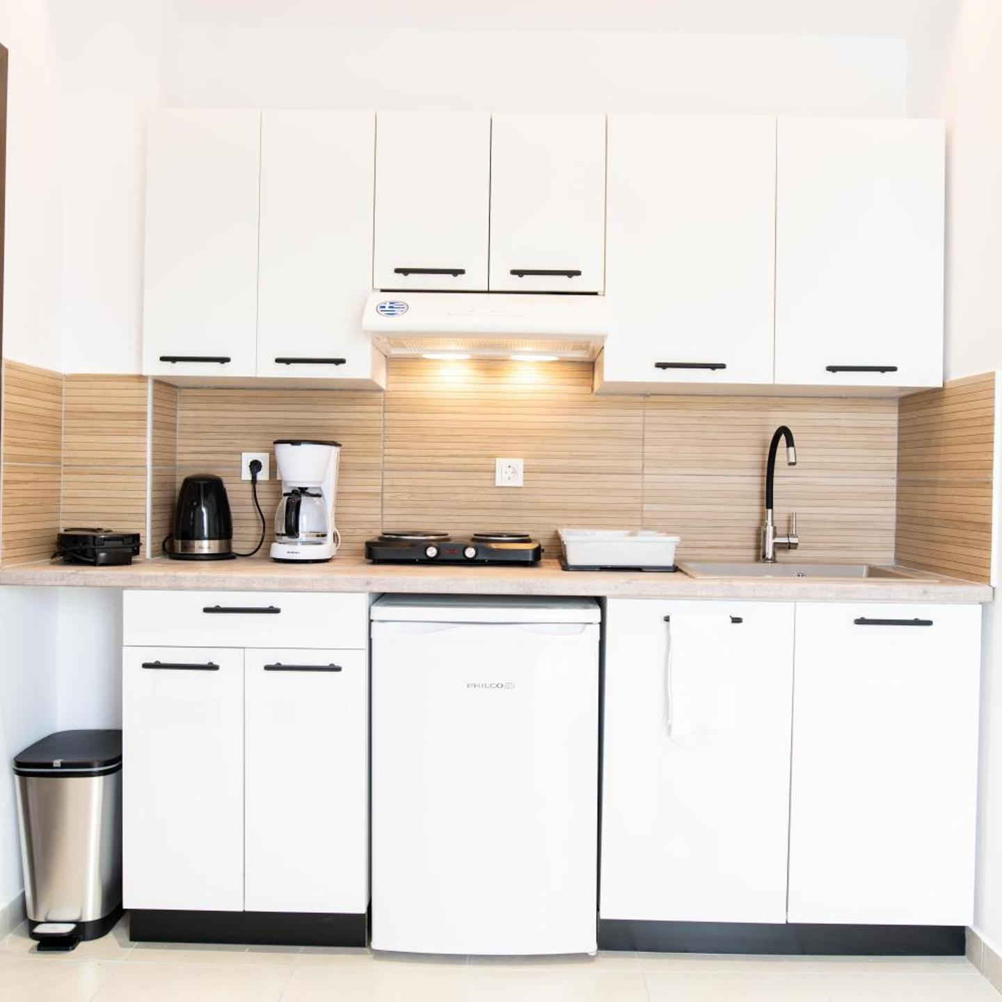 The apartment contains a kitchen incl. a fridge, hob, kettle, coffee machine,