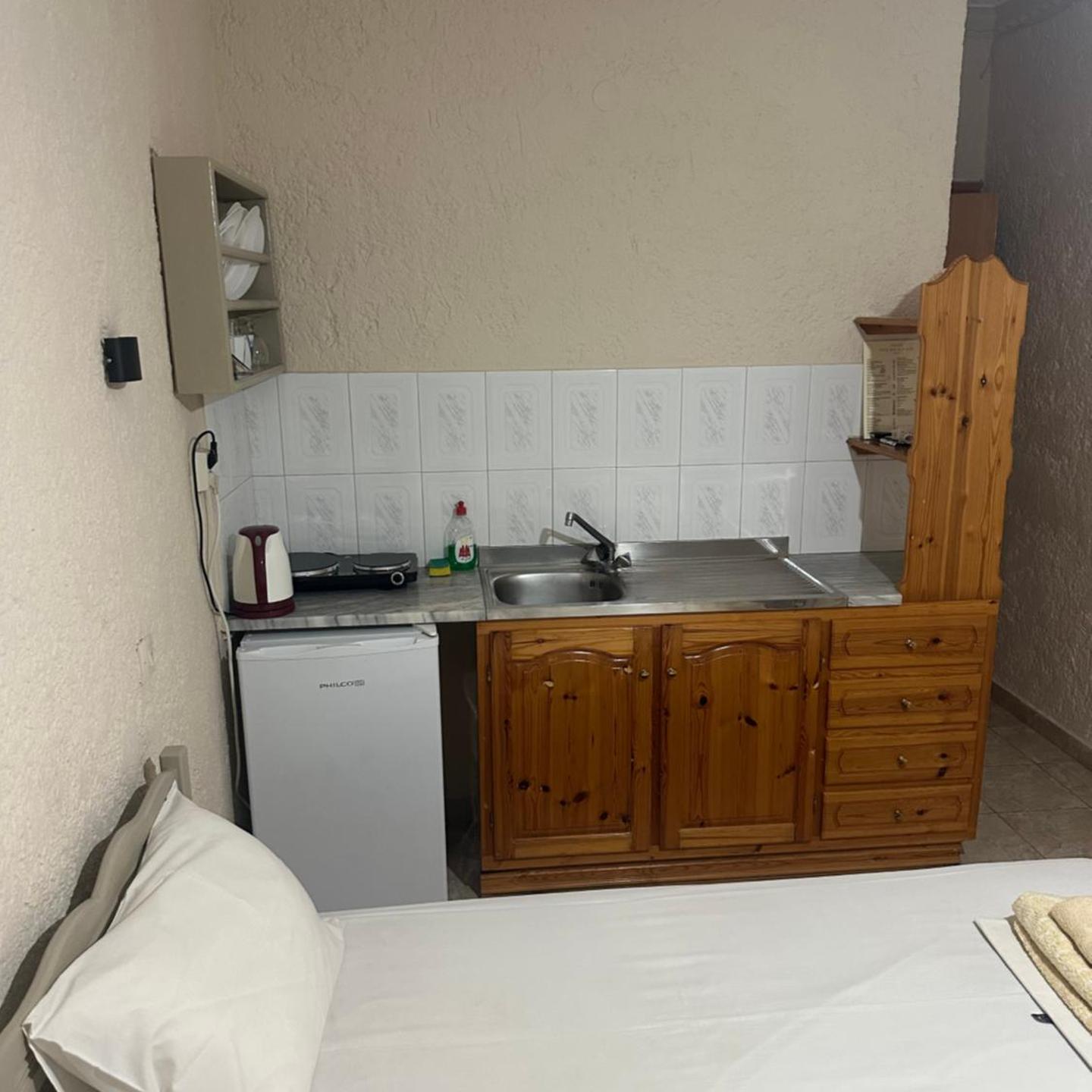 יש שם גם מקרר וכיריים, בנוסף לקומקום.