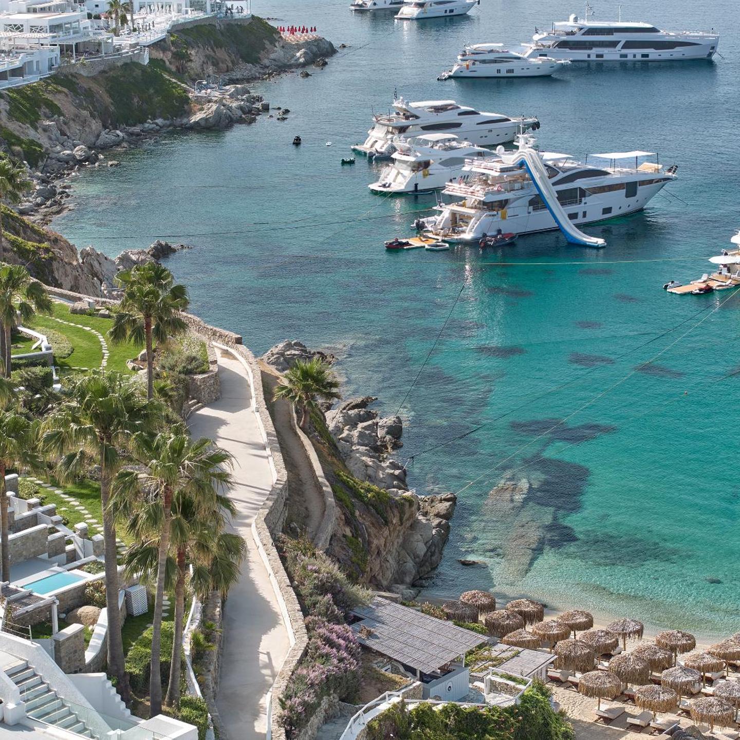 נמל התעופה מיקונוס (Mykonos) נמצא במרחק של 4 ק"מ מאתר הנופש. העיירה מיקונוס נמצאת במרחק של 5 דקות נסיעה משם. המלון יכול גם לארגן שיט שמפניה בשקיעה או סיורים במסוק.