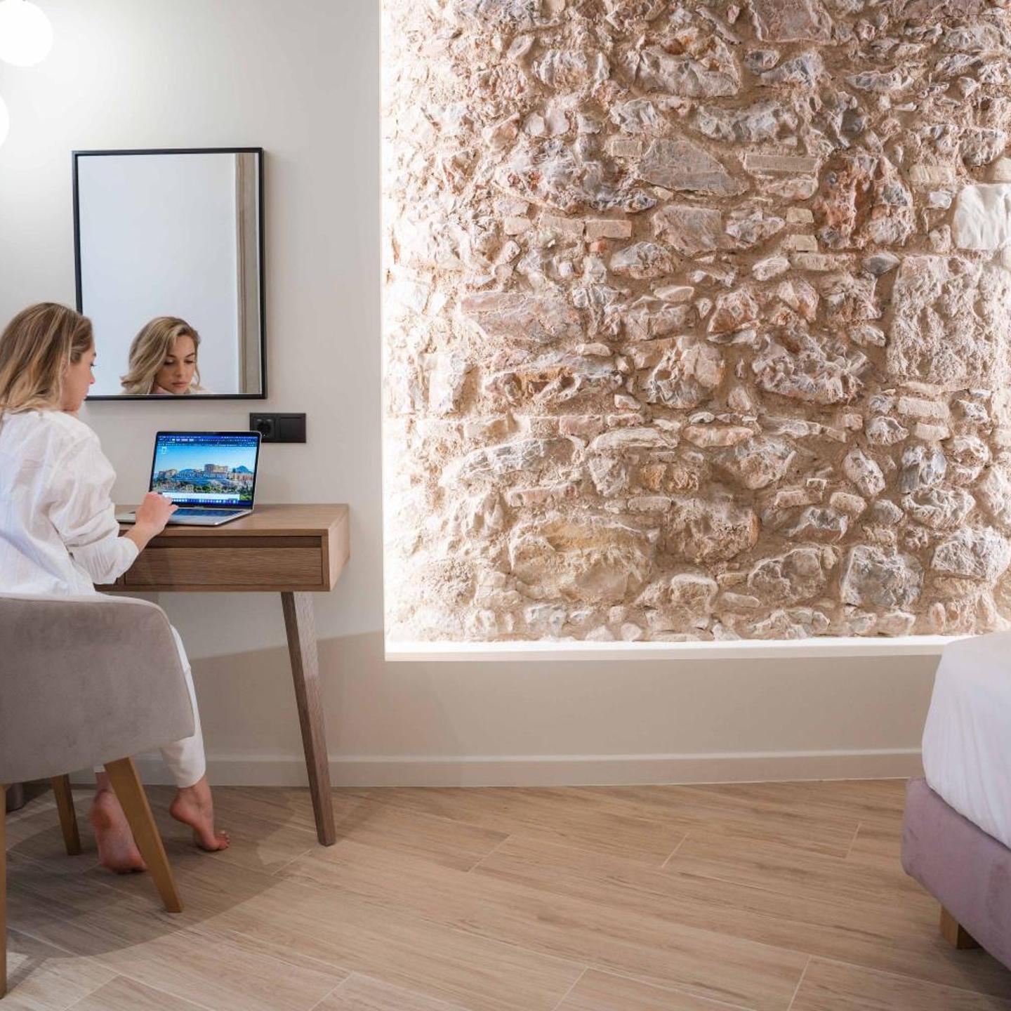 Each individually decorated suite offers free Wi-Fi is equipped with air conditioning, a flat-screen TV’s with, a fridge, oven , microwave, kettle, Nespresso coffee machine with welcome capsules, a shower, a hairdryer, a safety deposit box and a desk. All the suites offer double beds 160 x200 cm with a high quality mattress. At Paleo every room is equipped with a wardrobe and a private bathroom.