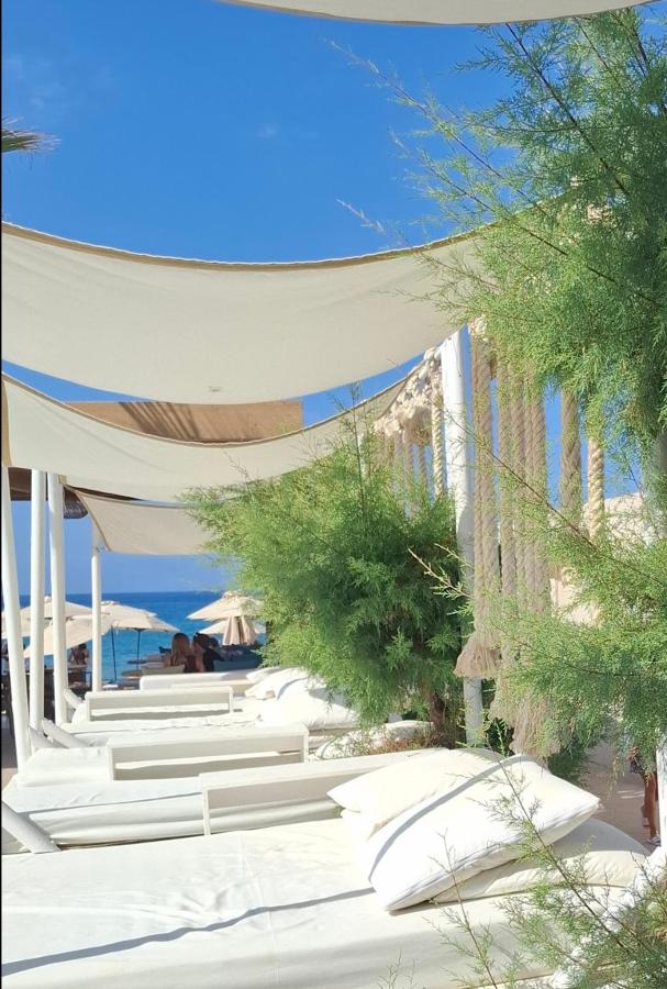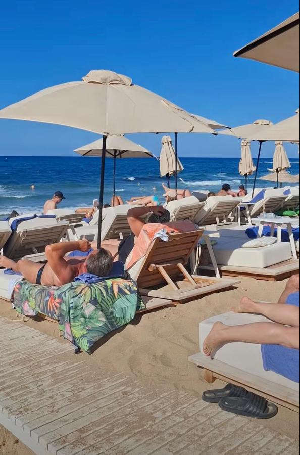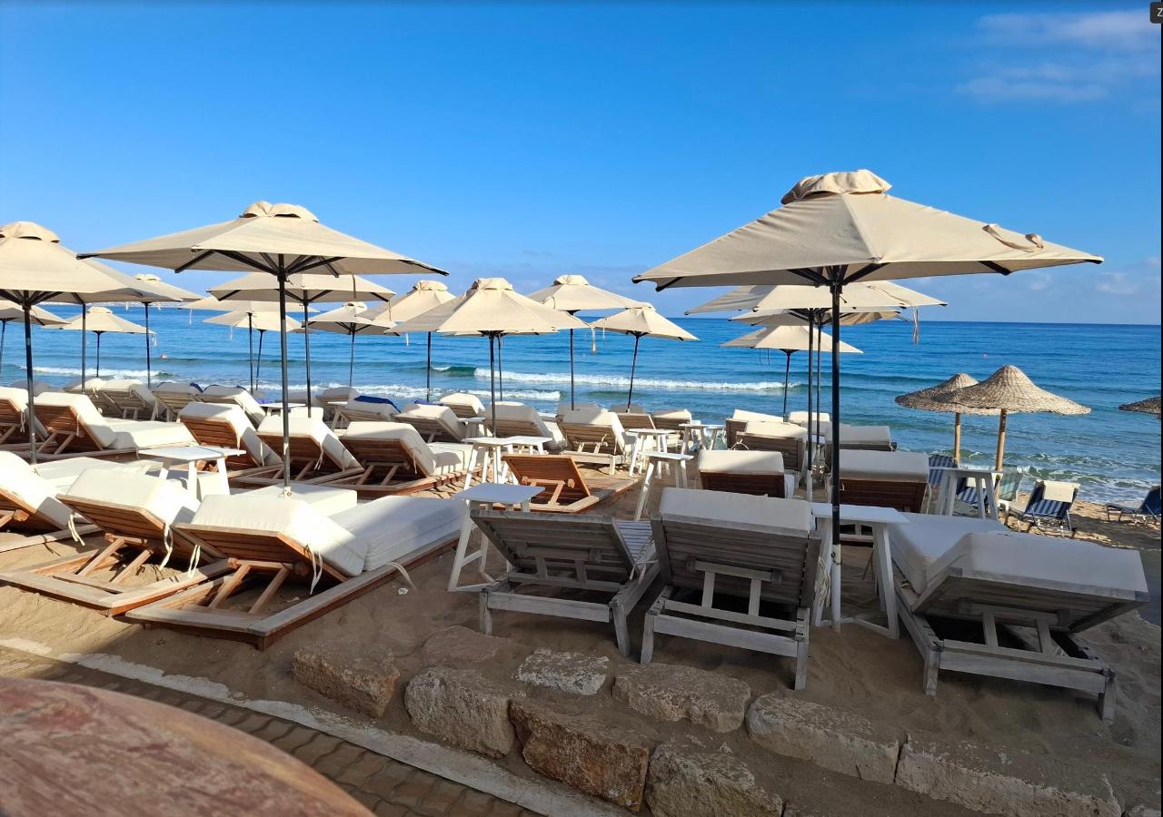 החדר, הריהוט והמיטות. הברכה ומיטות השיזוף סביבה, אזור לאכילה מאוד נעים אל מול הים, מיטות השיזוף מול הים