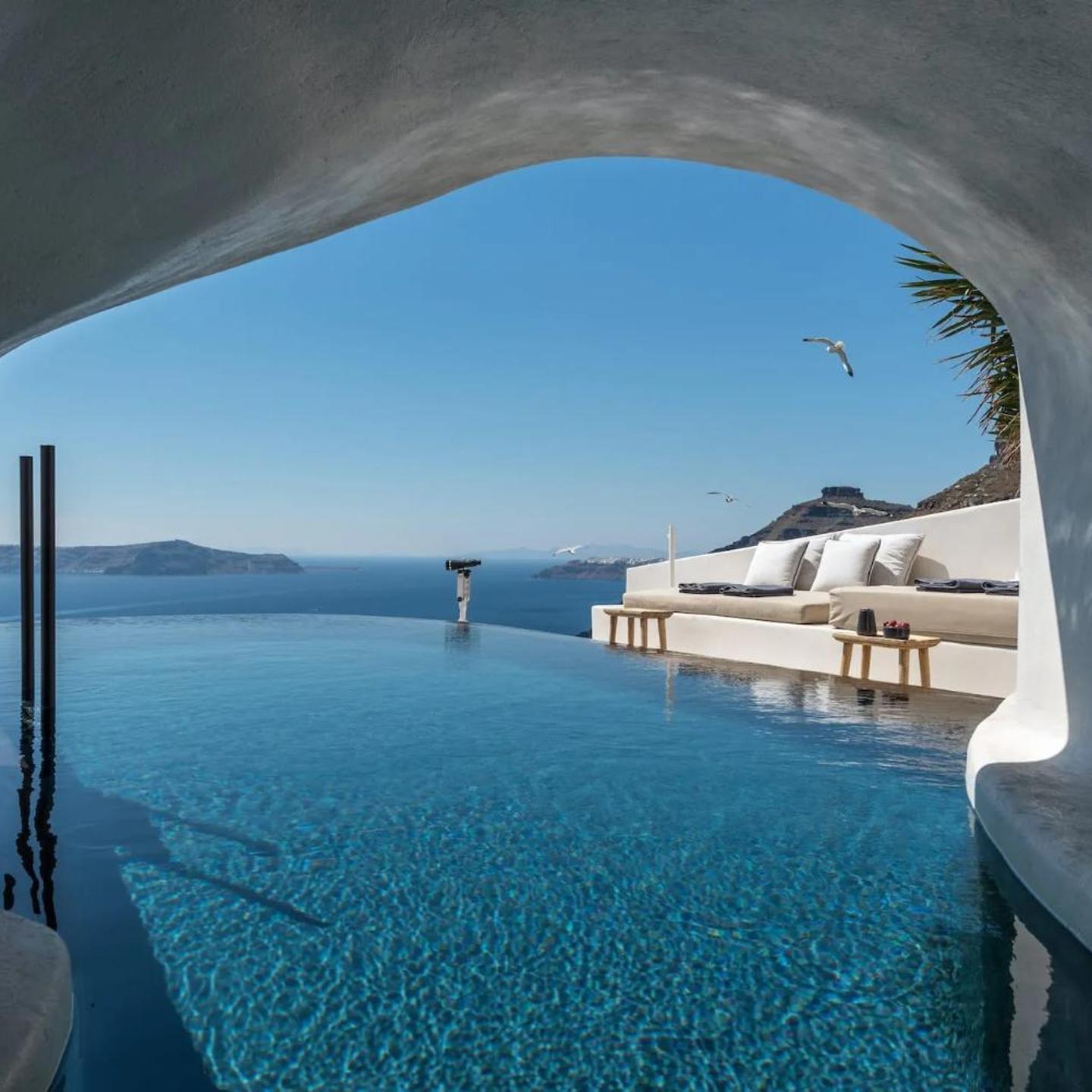 מקום האירוח שוכן בצורה אנכית על צוקי הקלדרה, ובריכת השחייה ממוקמת בקומה הנמוכה ביותר, שמשקיפה על הים האגאי והר הגעש.