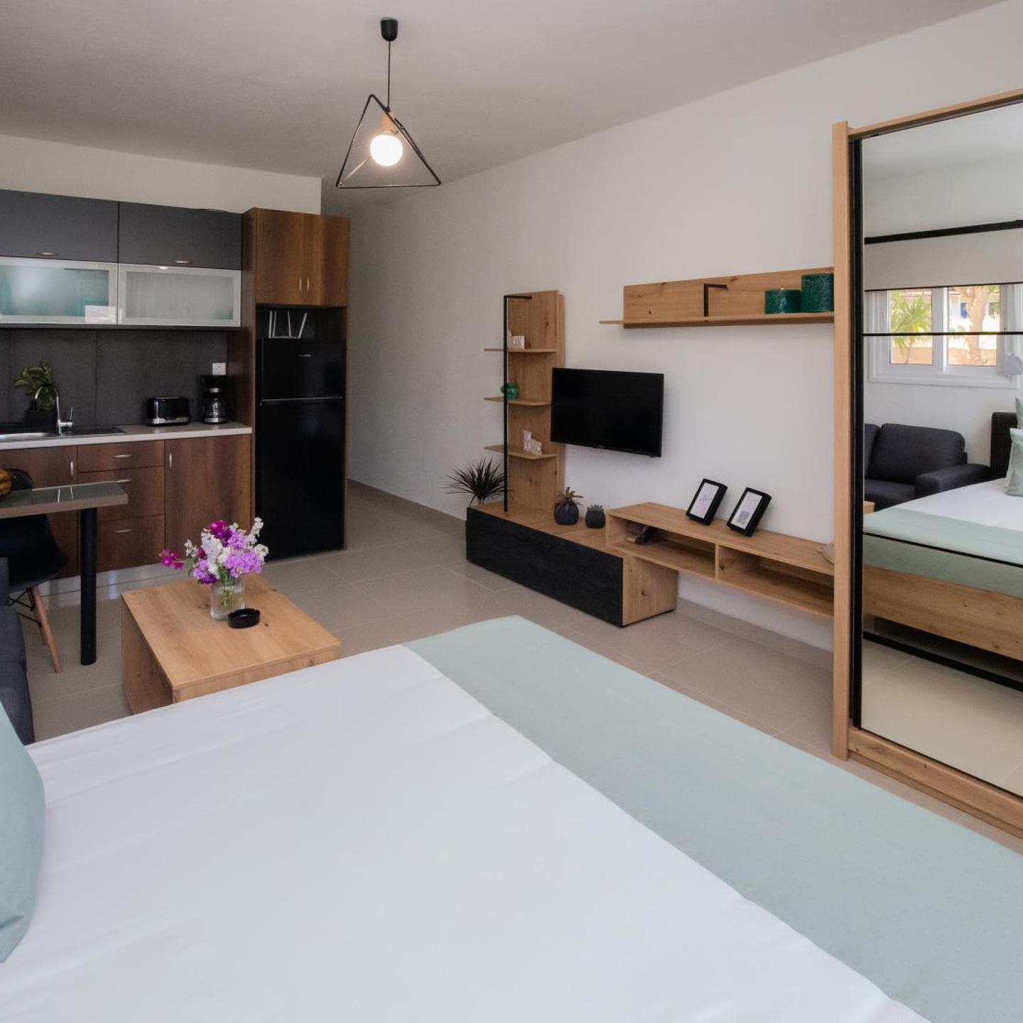 במקום האירוח Studio Athena with panoramic view of MakryGialos, האורחים יוכלו ליהנות ממרפסת, נוף לעיר, פינת ישיבה, טלוויזיה בעלת מסך שטוח, מטבח מאובזר במלואו עם מקרר ותנור וחדר רחצה פרטי עם מקלחת ומוצרי טיפוח ללא תשלום. יש גם כיריים וטוסטר, בנוסף למכונת קפה וקומקום.