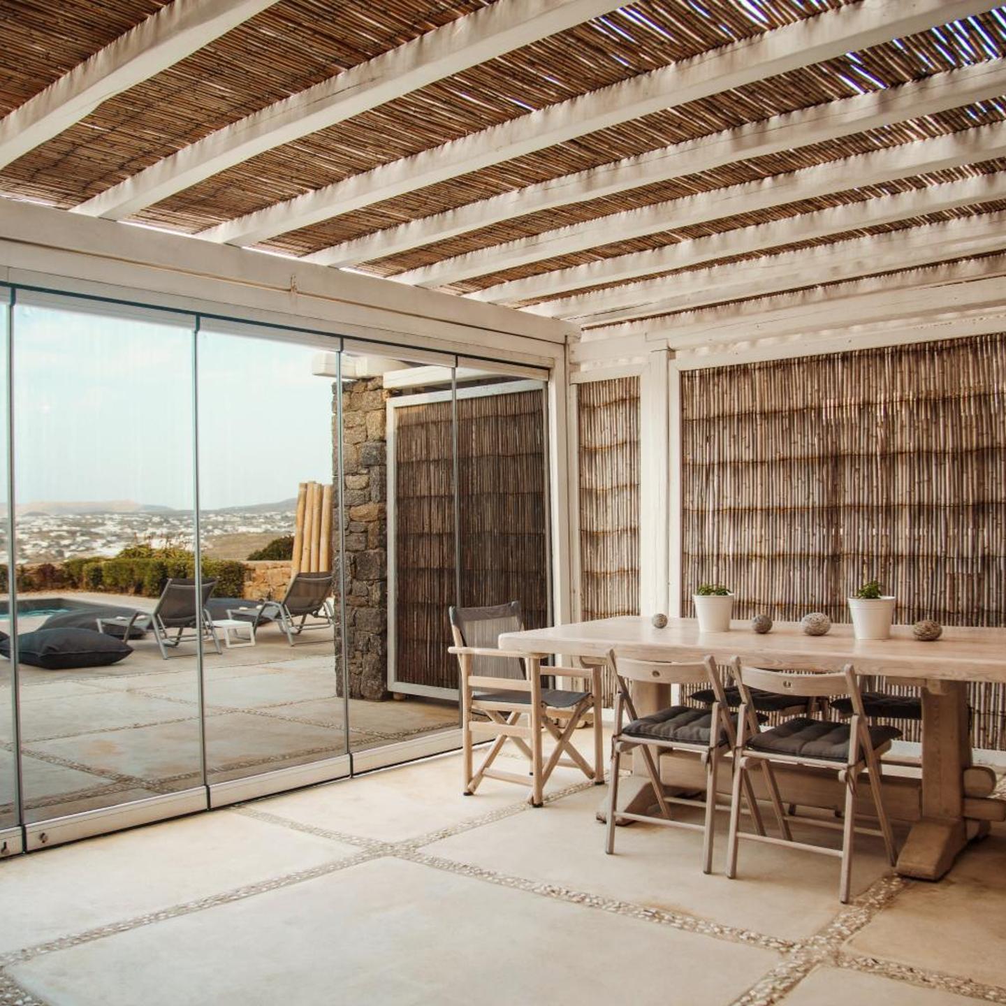 Villa Eirēnē is a luxurious yet very cozy villa, located in the region of Kanalia, Ornos on the vibrant island of Mykonos. It is situated on a hill, overlooking the sea as well as the mykonian town, offering breathtaking views. Whether you are a family, couple or a group of friends you will find this vacation rental perfect for you since the area is considerably quiet yet very close to the most famous beaches, restaurants and bars of Mykonos. The Villa is part of a condominium with beautiful surroundings and two big swimming pools that are accessible to all residents.