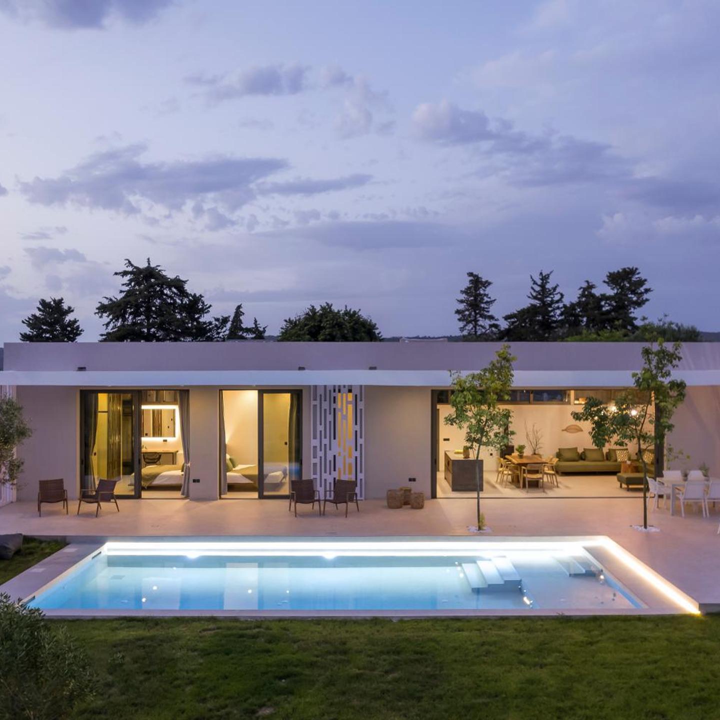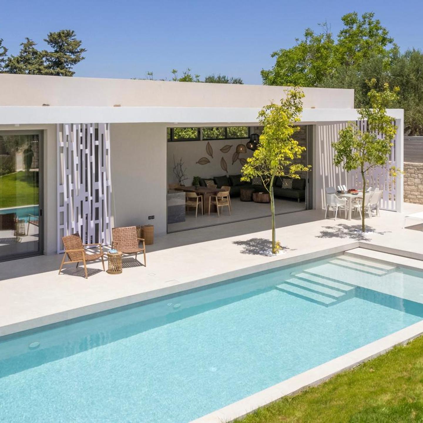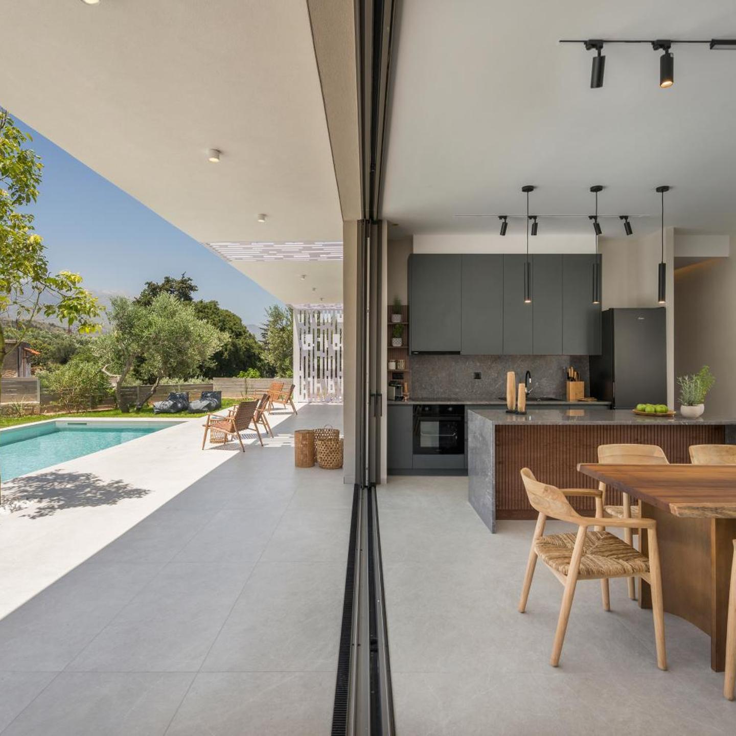 The villa is located in a quiet neighborhood surrounded by olive trees, while providing easy access to local attractions and beaches like Georgiopoli and Kournas.